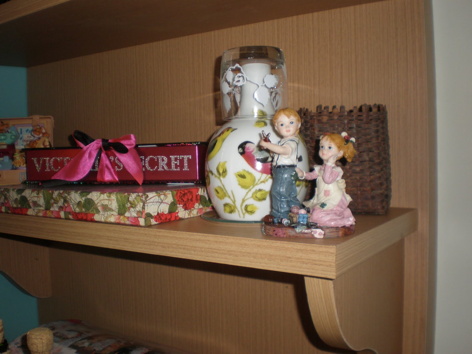 Menina, como ficou linda a prateleira com suas coisinhas lindas!!! Amei ! Seus vasinhos estão lindos e as fofurices também!